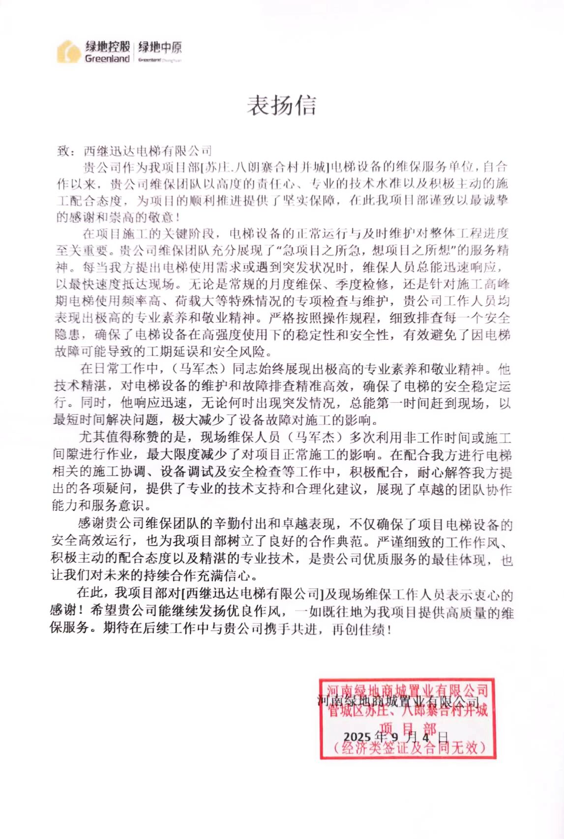 一封來(lái)自河南綠地商城置業(yè)項(xiàng)目的表?yè)P(yáng)信